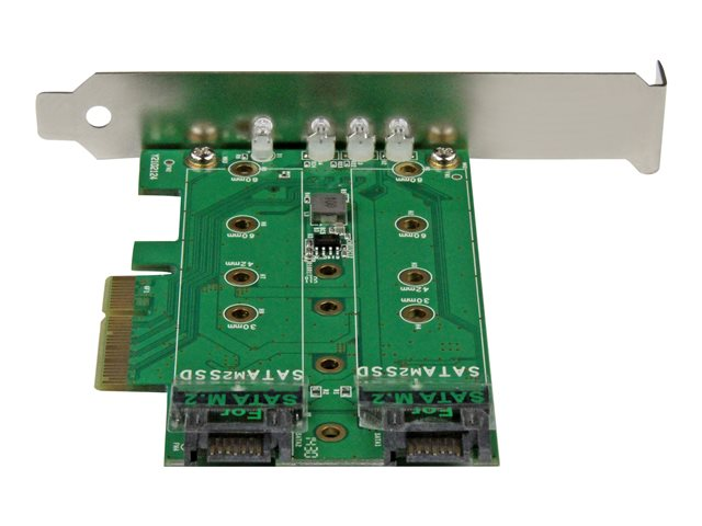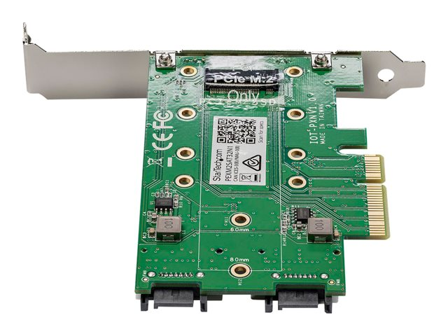 Mount both PCIe (NVMe) and SATA based M.2 SSDs inside your computer using this PCI Express adapter card. This 3-port M.2 SSD adapter card is one of the only cards that supports both PCIe and SATA-based M.2 SSDs (solid-state drives). It's a versatile way to expand the overall storage capacity of your desktop PC or server. Plus, because it supports a high-speed PCIe M.2 drive, you can increase the speed and performance of your computer.