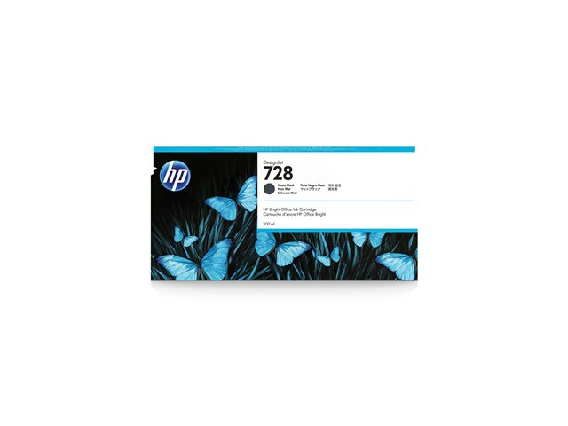 Produktbeskrivelse HP 728 - mat sort - original - DesignJet - blækpatron Produkttype Blækpatron Udskriftsteknik Blækprinter HP underbrand DesignJet Printfarve Mat sort (pigmenteret) Kapacitet 300 ml Kompatibel med DesignJet T730, T830 -