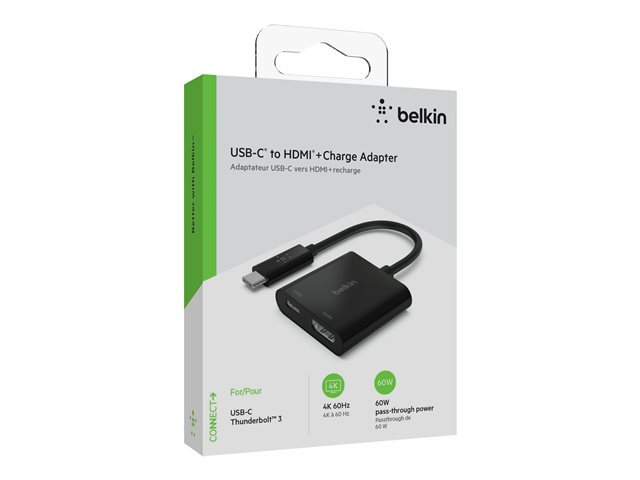 The USB-C to HDMI and charge adapter connects to your laptop or tablet via USB-C port, giving you both an HDMI port for video display and a USB-C port for power. Its Plug-and-Play design works universally with laptops and other USB-C devices. It offers portable flexibility that's great for classrooms, conferences, and trade shows.