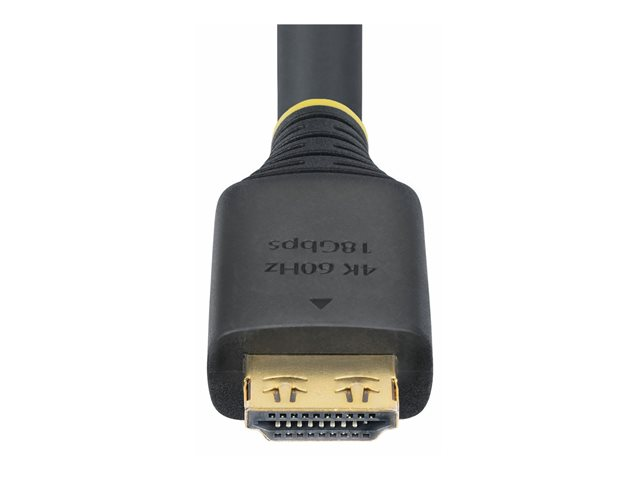 The StarTech.com HDMI2-CABLE-GRIP-7M is designed for longevity and performance, making it a choice for connecting displays, monitors, and TVs. This high-speed HDMI cable features a robust 6 mm diameter and is crafted with aluminum mylar foil shielding, ensuring protection against electromagnetic interference (EMI). With a strain relief feature and gripping connectors, the cable provides a secure fit for reliable connections. It supports an 18 Gbps data rate, enabling video resolutions up to 4K at 60 Hz and 1440p UWQHD at 144 Hz, along with support for Dolby TrueHD and Dolby Atmos audio formats. With a lifespan of up to 10,000 insertions and 2,000 bends, this cable is built to withstand frequent use while maintaining performance.