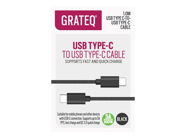 Produktbeskrivelse GRATEQ - USB Type-C kabel - 24 pin USB-C til 24 pin USB-C - 1 m Type USB Type-C kabel Egenskaber USB Power Delivery (100 W), Quick Charge 3.0, hurtigtopladende support Kabel længde 1 m Forbindelsesled 24 pin USB-C - han Stikforbindelse (anden ende) 24 pin USB-C - han Vurderet strøm 5 A Farve Sort -