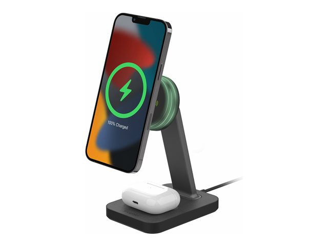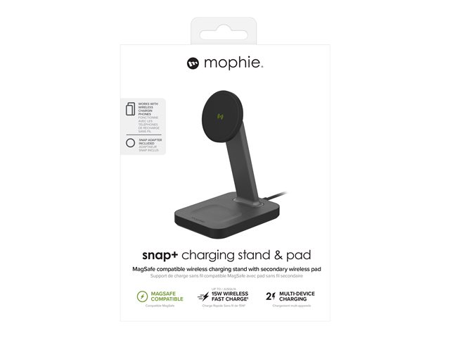 Med den stående, magnetiske snap+ opladningsstander samt opladningspladen kan du oplade din telefon og dine earbuds, så de altid er klar til brug. Standeren holder din enhed stående eller liggende og leverer op 7,5 til 15 W trådløst. Så du kan se en film, videochatte eller læse beskeder, mens din telefon er magnetisk tilsluttet snap+ standeren og opladningspladen. Der er sågar et decideret sted til opladning af dine AirPods.