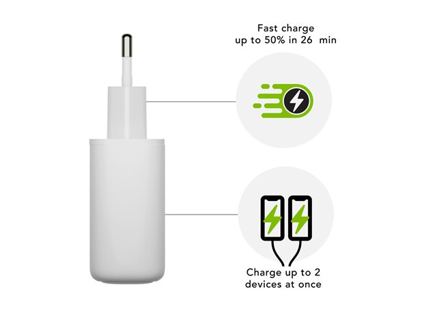 Denne strømadapter er udstyret med GaN-teknologi og leverer 25 watt strøm, samtidig med at den sikrer hurtig opladning. Den giver mulighed for samtidig opladning af op til 2 enheder via de to 24-bens USB-C-udgangsstik. Overophedningsbeskyttelsen sikrer sikkerhed under opladning, hvilket gør den til et pålideligt valg til daglig brug.