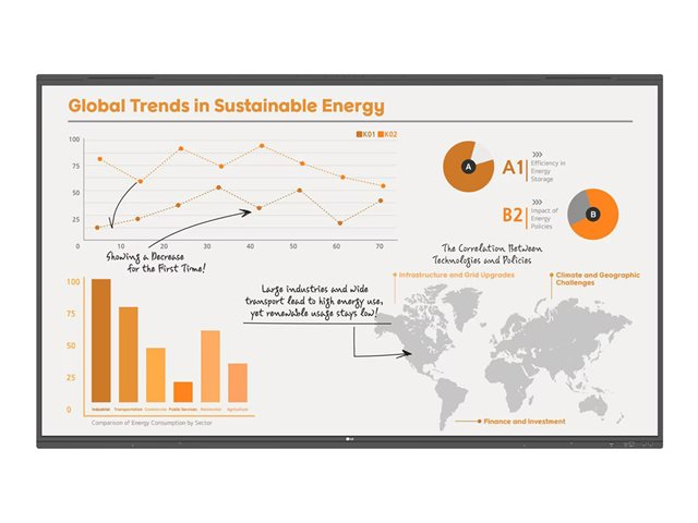 Udstyret med et højttalersystem, der leverer en udgangseffekt på 52 watt gennem fire højttalere, skaber denne skærm en fordybende lydoplevelse. LG CreateBoard understøtter flere tilslutningsmuligheder, herunder USB, HDMI og LAN, hvilket gør integration med eksisterende systemer ligetil. Dens 8 GB RAM og 64 GB lagerkapacitet, der drives af en robust octa-core processor, muliggør jævn drift og webbrowsing. Med funktioner som LG ConnectedCare og smart energibesparelse kan brugerne nyde godt af en pålidelig og effektiv løsning til deres præsentationsbehov.