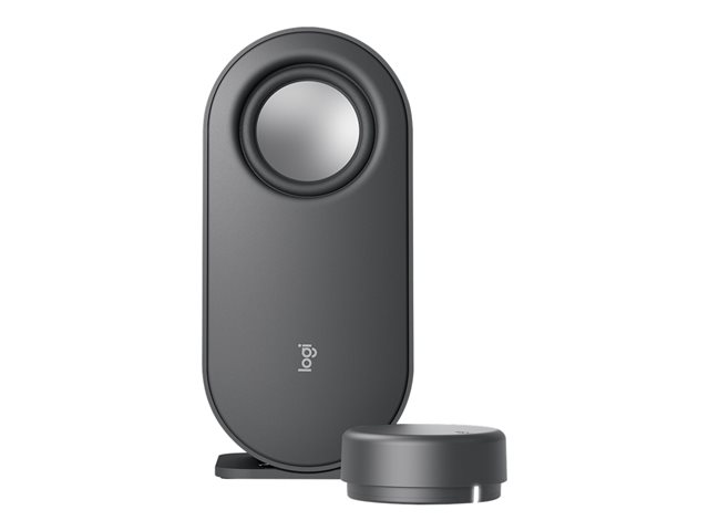 - Sleek, oval-shaped satellite speakers come in refined graphite gray