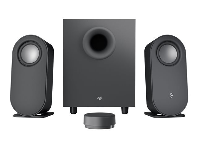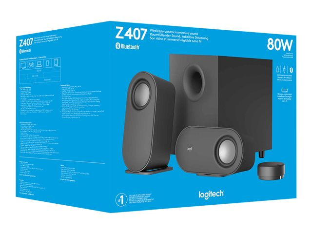Brug drejeknappen for at få fantastisk lyd til din stationære computer med Z407 Bluetooth-computerhøjtalere. Det ekspertindstillede 2.1-højtalersystem har 80 watt spidsbelastning og 40-watt RMS. Få intens lyd med den nedadvendte subwoofer som giver "boom" til din lyd, mens digital signalbehandling holder klarhed på tværs af lydspektret. Stilfulde ovale satellithøjtalere ligger vandret eller lodret. Placer dem, som du vil så de passer til dit rum. Styr det hele med den Bluetooth-aktiverede trådløse kontrolknap. Juster bas og lydstyrke, spring sange over og sæt dem på pause uden at komme op af sofaen. Tilslut med Bluetooth-, USB-A- eller 3,5 mm-indgange.