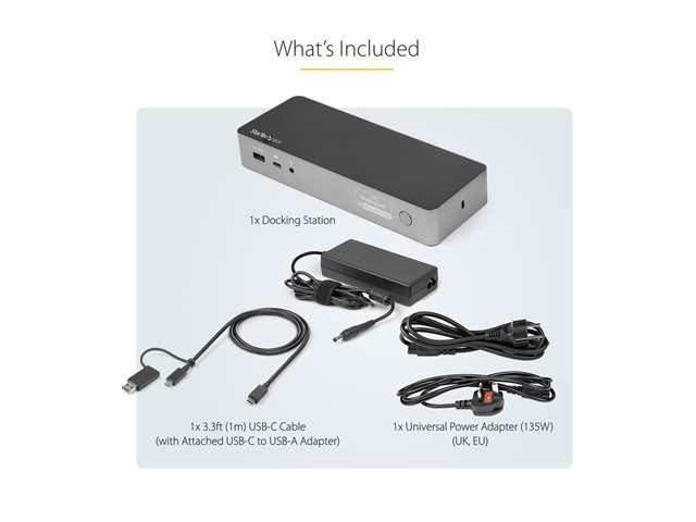 For fast setup right out of the box, the combo cable (USB-C with attached USB-A adapter) lets you connect any laptop. The dock has mounting holes for workstation mounting (bracket not included).