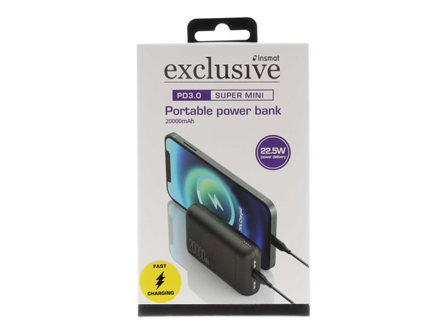 Produktbeskrivelse Insmat powerbank - Li-pol - USB, 24 pin USB-C - 22.5 Watt Produkttype Powerbank Dimensioner (B x D x H) 7.1 cm x 11.5 cm x 2.8 cm Vægt 360 g Udgangsforbindelsestype Total 2: USB, 24 pin USB-C Batteri Litium-polymer - 20000 mAh Strømforsyning 22.5 Watt Strømenhedsoplysninger - 24 pin USB-C with Power Delivery - 20 W