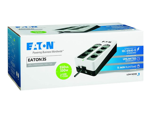 - Eaton 3S leverer batteribackup under strømafbrydelse og avanceret overspændingsbeskyttelse for at forhindre skader fra lynnedslag eller utilsigtet overspænding på nettet